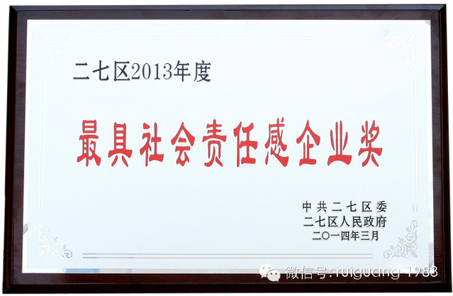 河南省瑞光印務(wù)股份有限公司被中共二七區(qū)委、二七區(qū)人民政府評(píng)為二七區(qū)2013年度最具社會(huì)責(zé)任感企業(yè)獎(jiǎng)。
