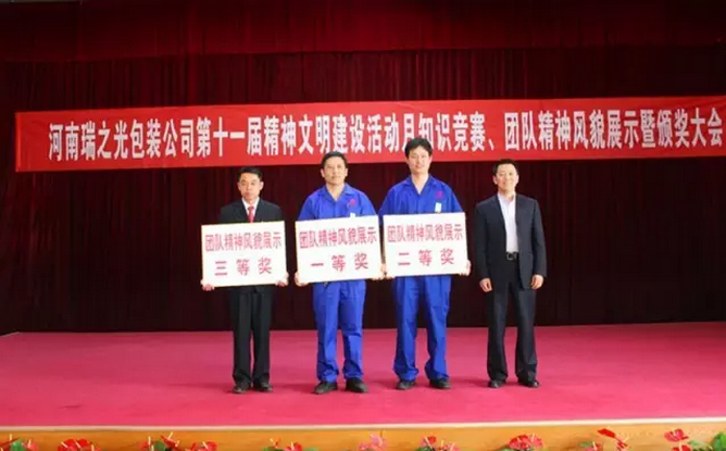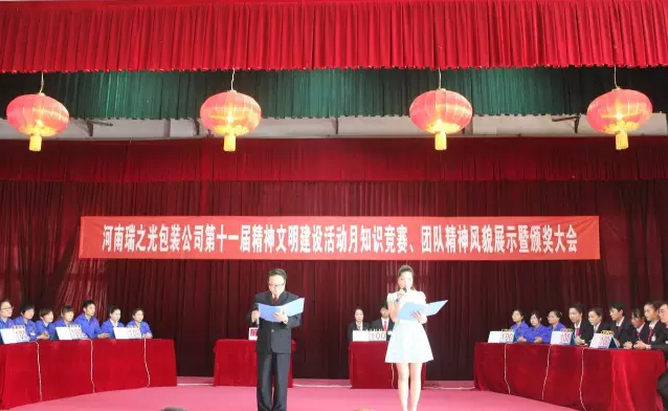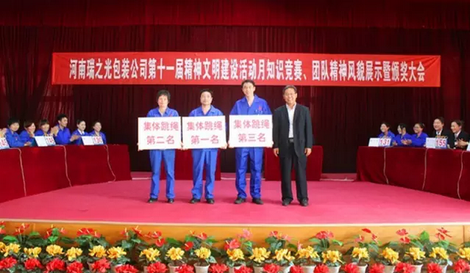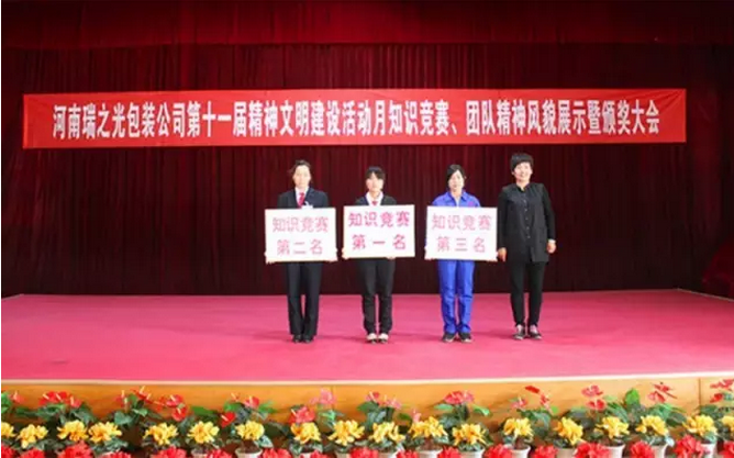 4月29日下午,河南瑞之光包裝印刷股份有限公司舉行第十一屆“精神文明建設(shè)活動月”知識競賽、團(tuán)隊精神風(fēng)貌展示暨頒獎大會。河南瑞之光文化產(chǎn)業(yè)集團(tuán)總裁張歌偉攜集團(tuán)領(lǐng)導(dǎo)班子出席此次活動。活動現(xiàn)場根據(jù)公司《愛心基金管理辦法》進(jìn)行愛心基金捐款,隨后,開展了知識競賽和團(tuán)隊精神風(fēng)貌展示,經(jīng)過各參賽隊伍的激烈角逐和評委們的認(rèn)真選評,現(xiàn)場評出冠、亞、季軍并當(dāng)場頒獎。