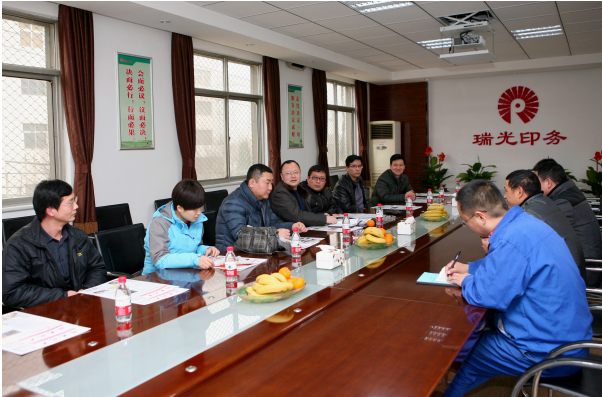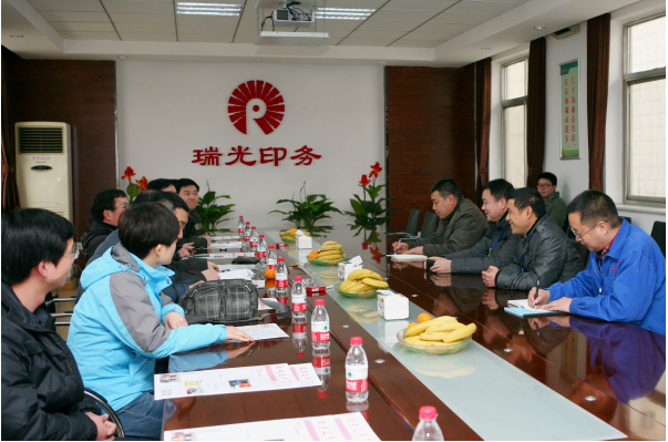圖為瑞光印務(wù)總經(jīng)理王在東及公司有關(guān)人員與考察領(lǐng)導(dǎo)交流