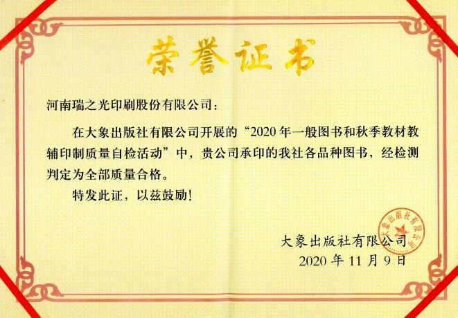 11月12日,大象出版社有限公司召開“2020年第二次印制工作會”,對9月份舉辦的“2020年一般圖書和秋季教材教輔印制質(zhì)量自檢活動”評比結(jié)果進行通報,河南瑞之光印刷股份有限公司所承印的各品種圖書全部合格。