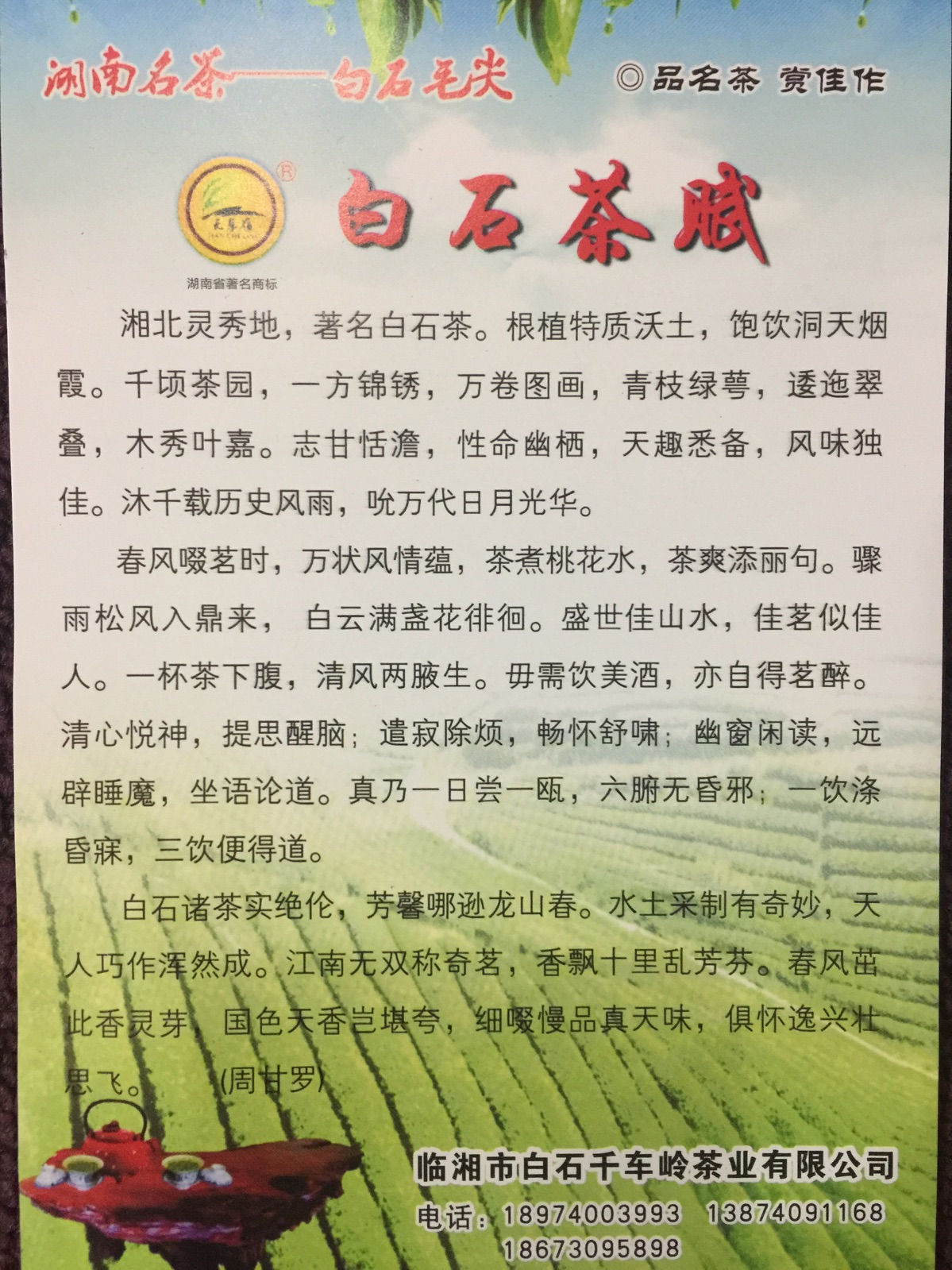 "天車嶺"白石茶葉,口感香醇,回味甘甜,持久耐泡
