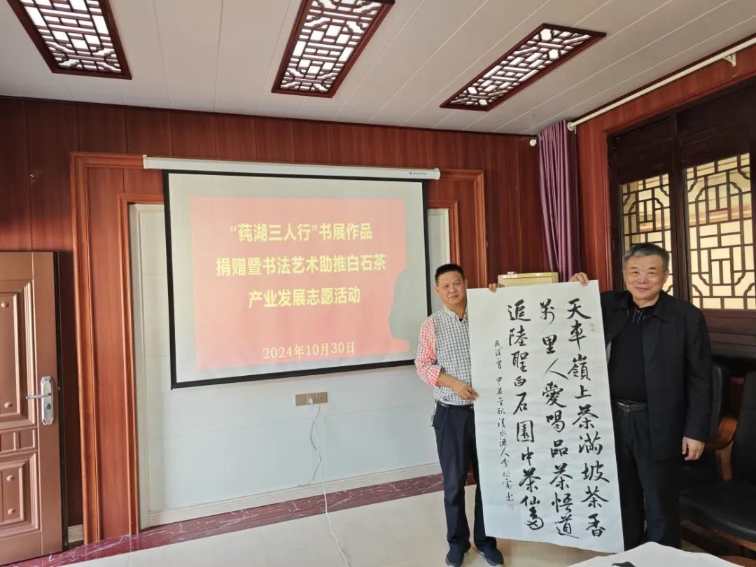 市文聯(lián)副主席、市書協(xié)主席蕭久勝現(xiàn)場捐贈“莼湖三人行”展出的《白石茶賦》等兩幅作品,書協(xié)顧問余智民老師、市書協(xié)副主席李建軍老師都捐贈了心愛的作品,市文聯(lián)黨組成員、副主席、書協(xié)黨支部副書記姚湘北、市文聯(lián)副主席、書協(xié)黨支部書記陳義斌、市書協(xié)副主席丁得志、周勇、沈光輝等書法家和創(chuàng)作骨干都志愿贈送各自特意為白石茶業(yè)創(chuàng)作的書法精品,彭中玉老師還贈送了中草藥標本和書法藝術相結合的作品,市書協(xié)顧問李征雷也贈送了特意為天車嶺白石茶撰寫的自編民謠和作品。