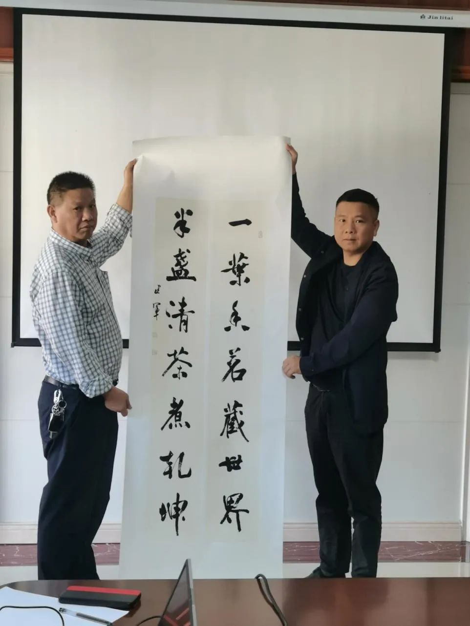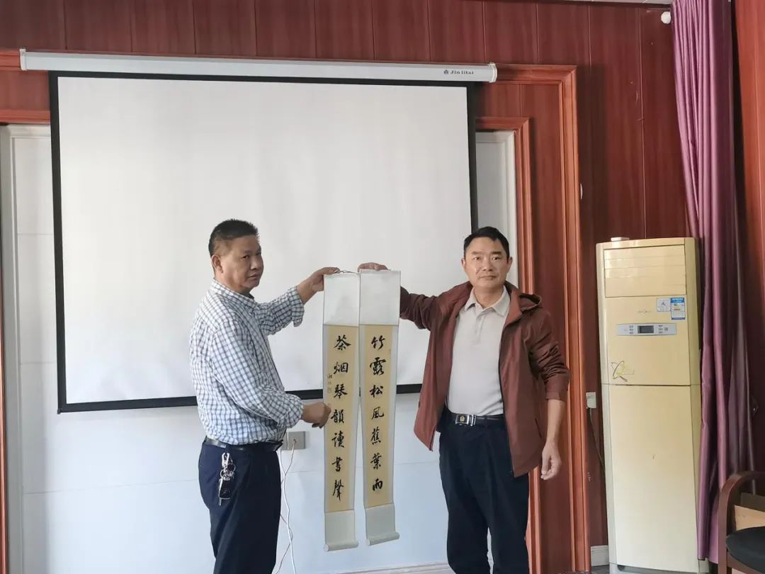 白石茶業(yè)負責人在簡短的歡迎詞中表示:歡迎各位在這秋高氣爽,如詩如畫的季節(jié),來到白石茶園開展臨湘市書法家協(xié)會書法“六進”志愿服務活動之——“莼湖三人行”書展作品捐贈暨書法藝術助推白石茶產(chǎn)業(yè)發(fā)展活動。書法是“國粹”,茶為“國飲”,歷史悠久的茶文化與璀璨奪目的書法藝術歷來就有不解之緣。臨湘因茶設縣,茶文化底蘊深厚,白石茶園不僅有美麗的神話傳說,還有毛主席喝了20年白石毛尖的紅色印記,是《挑擔茶葉上北京》歌曲的發(fā)源地。今天書法藝術進企業(yè),藝術家以茶入書法、以書法作品釋茶,講好臨湘茶故事,助力茶產(chǎn)業(yè)發(fā)展意義重大。