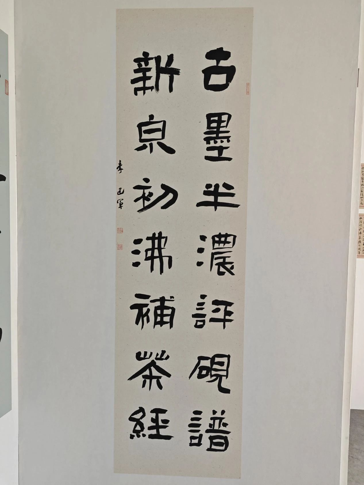 我在展廳通過三位書法藝術(shù)家的行書、楷書、草書、篆書、隸書、簡帛等各種書法作品感受到了書法藝術(shù)魅力,這些作品既有根植于傳統(tǒng)的經(jīng)典書法的精髓,也表達(dá)了藝術(shù)家放飛自我的個性。漫步展廳,愉悅欣賞,發(fā)現(xiàn)其中有多幅與茶相關(guān)的作品。