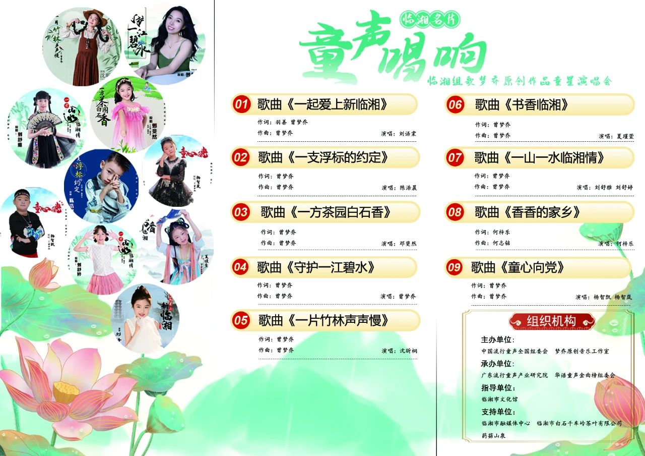 來自全國各地的小歌手演唱的臨湘組歌包括《一起愛上新臨湘》《一支浮標(biāo)的約定》《一方茶園白石香》《一片竹林聲聲慢》《書香臨湘》《一山一水臨湘情》《香香的家鄉(xiāng)》《童心向黨》等歌曲。